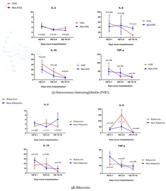 At HD 0–1, HD 2–9, and HD 10–19, in patients treated with ribavirin, IL-2 was 3.19 (0.13), 4.59 (1.44) and 2.80 (0.11), IL-6 was 33.87 (11.04), 152.53 (44.59) and 6.37 (2.02), IL-10 was 16.95 (8.48), 19.84 (11.14) and 3.19 (1.05), and TNF-α was 24.05 (2.66), 23.73 (8.72) and 11.77 (3.12), respectively. In patients not receiving ribavirin, IL-2 was 4.55 (0.73), 2.78 (0.10) and 6.15 (2.91) at HD 0–1, HD 2–9 and HD 10–19. IL-6 was 30.10 (12.36), 51.85 (27.31) and 5.75 (1.66), IL-10 was 27.22 (5.54), 10.58 (3.71) and 9.33 (5.65), and TNF-α was 42.36 (12.26), 18.86 (3.05) and 19.30 (5.21), respectively (