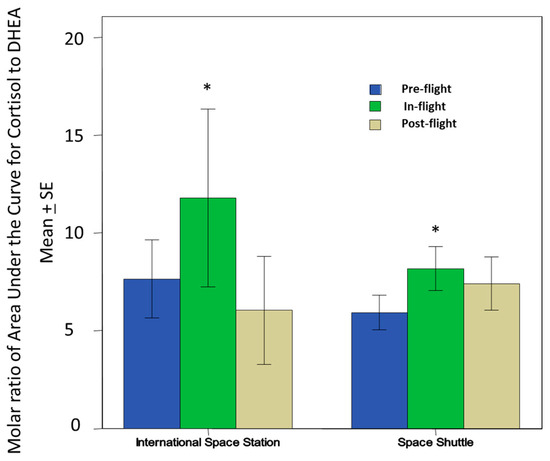 Salivary cortisol to DHEA [C]/[D] ratio comparison between pre-, in-, and post-flight timepoints within the International Space Station and the Space Shuttle eras. There is a significant increase in that ratio during flight for both Space Shuttle (N = 17) or ISS (N = 10). This increase may be associated with lower cellular immunity and innate immunity. This could also contribute to potentially greater inflammatory cytokines that would affect bone remodeling and bone growth. (Image taken from [21] Copyright © 2019 Rooney, Crucian, Pierson, Laudenslager and Mehta.), * p < 0.01.