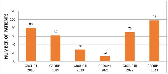 There were 142 patients in the identified group I (hospitalised in 2018–2019); 40 patients in group II (hospitalised in 2020–2021); and 168 patients in group III (hospitalised in 2022–2023).