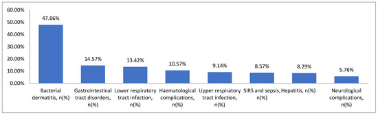 Complications of chickenpox occurred in 297 children (84.86%). The most frequently diagnosed complications were bacterial dermatitis (168, 47.86%) and respiratory tract infections. Upper respiratory tract infections were observed in a total of 9.14% of the cases (32 children), while pneumonia and bronchitis occurred in 47 children (13.42%). Gastrointestinal disorders—vomiting, loose stools, abdominal pain—occurred in 51 children (14.57%). Neurological complications were found in 20 children (5.76%). Among them, acute cerebellar ataxia was found in 10 children (2.86%). Haematological disorders were observed in 37 (10.57%) children, most frequently leukopenia with neutropenia and thrombocytopenia (16 children, 4.57%). Of the less common complications, arthritis was observed in eight children (2.29%), otitis media in seven children (2%), and hepatitis in twenty-nine children (8.29%) (Figure 2).