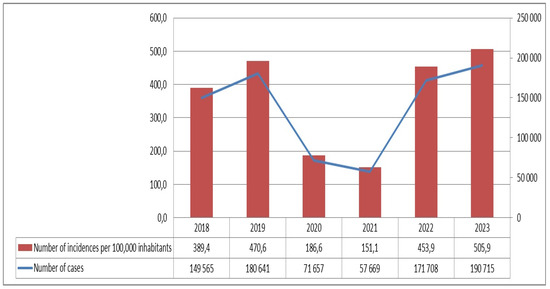 In Poland, we could also see a significant reduction in the incidence of chickenpox in 2020 and 2021. In 2020, 71,567 children were affected by chickenpox; the incidence was 186.6 per 100,000 population. Of the children, 0.51% required hospitalisation (368 patients). Children aged 0–4 years were most commonly ill (36,661—51%). In 2021, 57,669 children were ill; the incidence was 151.1 per 100,000 population. There were 210 children hospitalised, representing 0.36%. In contrast, significantly more children were ill before the pandemic. In 2018, 149,565 children contracted chickenpox, 0.73% required hospitalisation (1089 patients), and the incidence was 389.4 per 100,000. A total of 72,797 patients were children aged 0–4 years (48.7%). In 2019, 180,641 were ill, 0.64% were hospitalised (1156 children), and the incidence was 470.6 per 100,000. From 2022, a renewed increase in incidence was observed, with 171,708 children, 839 were hospitalised (0.49%), and the incidence was 453.9 per 100,000 population. Children aged 0–4 years accounted for 45% (77,836). In contrast, the highest number of children became ill in 2023—190,715; the incidence was 505.9 per 100,000 population. There were 0.57% of children hospitalised due to complications (1084 persons) (Figure 4) [4,19].