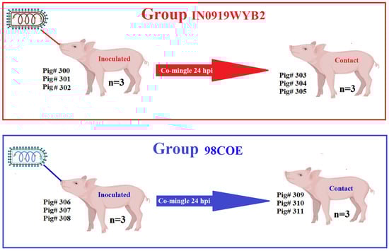 General overview of the experiment design. Two groups of pigs were used to evaluate the pathogenesis of the strains 98COE and IN0919WYB2, representative of the epidemic lineages responsible for outbreaks of VSIV in the US during 1997–1998 and 2019–2020. Each experimental group comprised six pigs, with three of the pigs in each group being inoculated in the snout. In comparison, the remaining three pigs evaluated the ability of each strain to be transmitted by direct contact. Contact pigs in each room co-mingled with inoculated pigs after 24 h post-inoculation (hpi). Pig# reflects diverse pigs’ roles during the experiment (inoculated or contact). This figure was created using BioRender.com under the agreement number YH27EC6GAL.