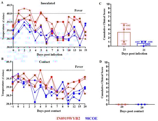 Comparison of clinical outcomes produced by infection with 98COE and IN0919WYB2. Rectal temperatures were monitored on specific days to detect fever in inoculated (A) and in contact pigs (B) after infection with different viruses. In inoculated pigs, red circles, squares, and triangles denote measurements for pigs 300, 301, and 302, respectively. The same shapes are used for the contact pigs to identify pigs 303, 304, and 305 from the IN0919WYB2 group. A similar pattern is followed for blue shapes (98COE group), identifying pigs 306, 307, and 308 (inoculated) and 309, 310, and 311 (contact), respectively. Final clinical scores were recorded from inoculated (C) and contact pigs (D) at each group. Scoring key: Pig #300: vesicular lesion in the inoculation site (1 point). Pig #301: vesicular lesions in the hind coronary bands (2 points each one). Pig #302: vesicular lesion in the inoculation site (1 point) and vesicular lesions in the hind coronary bands (2 points each one). Pig #307: vesicular lesion in the inoculation site (1 point). Pig #307: vesicular lesion in the inoculation site (1 point). Graphics were produced using the software GraphPad version 9.5.0.