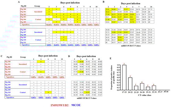 Overall, both groups observed no statistically significant differences in oral shedding (Figure 5C,D). However, a prolonged excretion of viral RNA was recorded in pigs inoculated with 98COE (10 dpi) compared with pigs inoculated with IN0919WYB2 (8 dpi) (Figure 5C). No differences were observed in the duration of oral shedding for contact pigs. Nevertheless, at 5 and 7 dpc, increased amounts of viral RNA were detected in pigs 310 and 311, ranging between 3.5 and 6.0 predicted TCID50/mL.