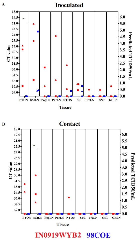 Postmortem evaluation between 98COE and IN0919WYB2. At 21 dpi, necropsies were conducted in inoculated (A) and contact (B) pigs from each group. Tissues were evaluated by RT-qPCR. The right Y-axis reflects the predicted TCID50/mL based on the CT value. Abbreviations indicate tonsil of the soft palate (PTON), submandibular lymph node (SMLN), popliteal lymph node (R-PopLN), parotid lymph node (ParLN), nasopharyngeal tonsil (NTON), spleen (SPL), prescapular lymph node (PreLN), and gastrohepatic lymph node (GHLN). IN0919WYB2 group pigs identified by red circles, squares, and triangles denote measurements of pigs 300, 301, and 302, respectively. Identical shapes are used for contact pigs to identify pigs 303, 304, and 305. A similar pattern is used to denote the 98COE group, with blue shapes identifying pigs 306, 307, and 308 (inoculated) and 309, 310, and 311 (contact), respectively. Asterisks represent tissues where means were significantly different between groups (p < 0.05) by the Welch’s t-test.