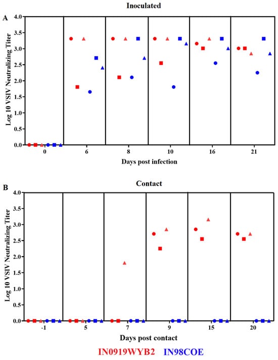 Differences in the adaptive immune response between 98COE and IN0919WYB2 groups during the infection in pigs. Graphics show the titer of neutralizing antibodies against VSIV at different times in inoculated (A) and contact (B) pigs infected with 98COE or IN0919WYB2. In inoculated pigs, red circles, squares, and triangles denote measurements from pigs 300, 301, and 302, respectively. The same shapes are used for contact pigs to identify pigs 303, 304, and 305 from the IN0919W9YB2 group. Similarly, the blue shapes (98COE group) identify pigs 306, 307, and 308 (inoculated) and 309, 310, and 311 (contact), respectively.