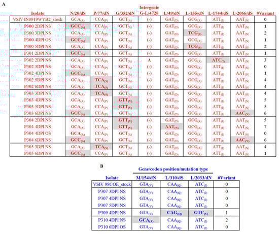Finally, we explored potential differences between 98COE and IN0919WYB2 regarding their ability to induce viral variants during the infection in pigs. Our results showed that inoculation with IN0919WYB2 resulted in more genetic variability during the infection in pigs compared with 98COE (Figure 9). Overall, a total of seven single nucleotide polymorphisms (SNPs) were found distributed in genes N, P, G, and L among viruses recovered from the pigs infected with IN0919WYB2, half of which were associated with nonsynonymous changes (Figure 9A). Additionally, an insertion was found in the intergenic G-L region from pig #302 (Figure 9A), which corresponds to the addition of an extra A in the highly conserved seven adenine polyadenylation signal present in the intergenic regions of VSV []. Our sequencing analysis revealed an interesting infection dynamic pattern, where seven viral variants at the consensus level were identified during the infection of pigs with IN0919WYB2 (Figure 9A). The consensus sequence associated with the viral stock (variant #0) was observed in only 2 of 20 viral isolates recovered during the infection, indicating that multiple viral variants dominated the infection dynamics in this experimental group. Specific changes at codon positions N/20, P/77, G/352, and L/2066 were observed in different variants, affecting multiple pigs at different time points during the infection. In this context, variant #1 was the most prevalent, identified in three pigs at multiple dpi (Figure 9A).