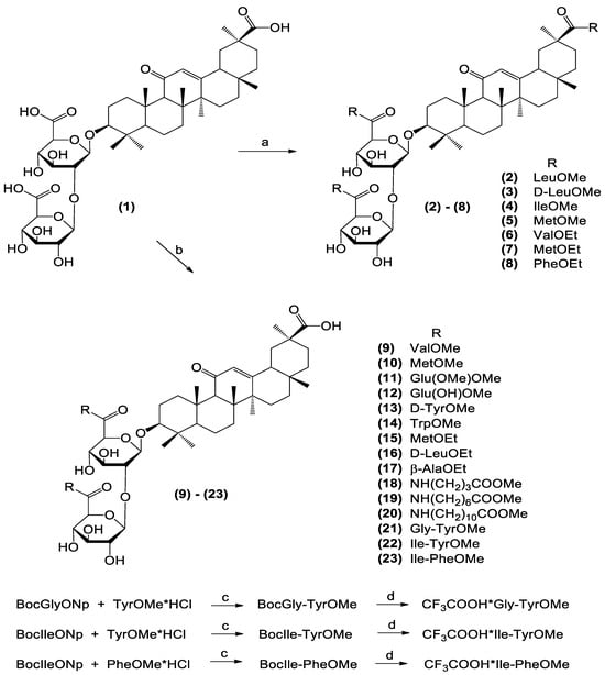 - Baltina, L.A.; Baltina, L.A., Jr.; Petrova, S.F.; Gabdrakhmanova, S.F.; Makara, N.S.; Sapozhnikova, T.A. Synthesis of Glycyrrhizic acid conjugates with amino acid methyl esters and their ability to stimulate antibody genesis in mice. Pharm. Chem. J. 2022, 56, 894–898. [Google Scholar] [CrossRef] [PubMed]