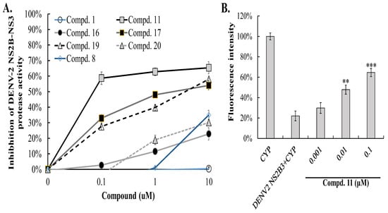 3.3. Inhibitory Effects of Compounds 11, 16, 17, 19, and 20 on DENV-2 NS3 Protease-Mediated Proteolysis