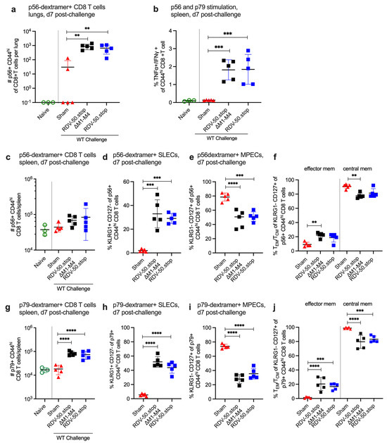 RDV-50.stop∆M1-M4 vaccination induced abundant virus-specific CD8 T cells in the spleens that were comparable to RDV-50.stop vaccination (Figure 1d–h; Supplementary Figure S2a–d). Splenic CD8 T cells were further identified as KLRG1+CD127− short-lived effector cells (SLECs) and KLRG1−CD127+ memory precursor effector cells (MPECs). Virus-specific SLECs (Figure 1d,f; Supplementary Figure S2b) and MPECs (Figure 1d,g; Supplementary Figure S2c) were comparable in mice vaccinated with either RDV-50.stop∆M1-M or RDV-50.stop. Vaccination with RDV-50.stop∆M1-M4 yielded modest changes in memory MPEC populations. RDV-50.stop elicited more CD62L− effector memory MPEC and RDV-50.stop∆M1-M4 elicited more CD62L+ central memory MPEC (Figure 1d,h; Supplementary Figure S2d). For both vaccines, the stimulation of splenic CD8 T cells with a combination of p56 and p79 peptides led to the increased production of antiviral effector cytokines TNFα and IFNγ in vaccinated mice compared to naïve mice (Figure 1i,j).