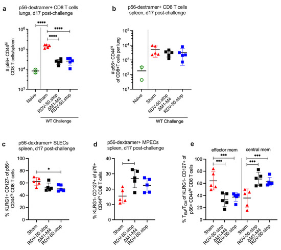 We also evaluated the effect of RDV-50.stop∆M1-M4 vaccination on virus-specific CD8 T-cell responses to WT virus challenge on d17 post challenge, a timepoint that approximates the typical peak of latency establishment in the spleen after IN infection. The quantity of virus-specific CD8 T cells observed at d17 post challenge in the lungs of sham-vaccinated mice surpassed the levels detected in the RDV-50.stop-vaccinated mice upon challenge (Figure 4a). In the case of the spleen at d17 post challenge, p56-specific CD8 T cells were not more numerous in sham-vaccinated mice compared to RDV-50.stop∆M1-M4-vaccinated mice but exhibited an increased SLEC and CD62L− effector MPEC phenotype (Figure 4b,c,e). The p79-specific CD8T cells were more abundant in sham-vaccinated mice with a similar effector cell phenotype compared to vaccinated mice (Supplementary Figure S4a,b,d). At d17 post challenge, the virus-specific CD8 T-cell response was stronger in the sham-vaccinated mice compared to both RDV-50.stop∆M1-M4- and RDV-50.stop-vaccinated mice. We attribute this to the lack of pre-existing immunity in sham-vaccinated mice. These unvaccinated mice fail to control the initial acute replication and colonization of the spleen, and this results in a stronger effector T-cell response at d17 post challenge. In contrast, RDV vaccination elicited a pre-existing CD8 T-cell response in both the lungs and spleen that effectively blocked acute replication in the lungs and impaired splenic colonization, leading to a lower overall response at d17 post challenge.