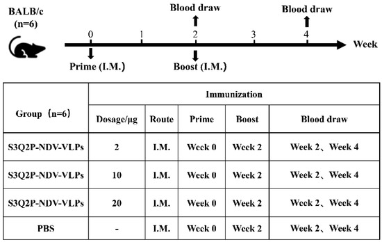 Immunization schedule and groups: BALB/c mice (n = 6 per group) were immunized with different doses of NDV-S3Q2P-VLPs (2 μg, 10 μg, and 20 μg) or PBS as a control. Mice were immunized intramuscularly (I.M.) with a prime dose at week 0 and a boost dose at week 2. Blood samples were collected at week 2 and week 4 to assess immune responses.