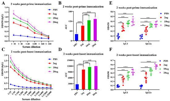 S-protein-specific IgG titers were measured using ELISA. As shown in Figure 5A, all VLP-immunized groups exhibited significantly higher IgG titers compared to the PBS group at 2 weeks post-prime. Antibody titers increased with dose, with the 20 μg group showing the highest titers. An area under the curve (AUC) analysis confirmed a dose-dependent antibody response (Figure 5B). At 2 weeks post-boost, IgG titers continued to rise in all immunized groups (Figure 5C), and an AUC analysis (Figure 5D) also demonstrated robust IgG responses in all VLP-immunized groups, significantly higher than in the PBS group. These results suggest that NDV-S3Q2P-VLPs elicit a potent, dose-dependent S-protein-specific IgG response, which is further enhanced following the booster immunization.