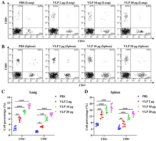 To evaluate the T cell responses induced by NDV-S3Q2P-VLPs, flow cytometry analysis was performed to assess the CD4+ and CD8+ T cell populations in the lung and spleen of immunized mice, 2 weeks after immunization with different doses of the vaccine. The results showed that all VLP vaccine doses induced a significantly higher number of CD4+ and CD8+ T cells in the lung compared to the PBS control group, with the 20 μg dose showing the most pronounced difference (Figure 7A,C). Similarly, CD4+ and CD8+ T cells were also significantly increased in the spleen of VLP vaccine-immunized mice (Figure 7B,D). In addition, the upregulation of CD4+ and CD8+ T cells in the spleen was more pronounced than that observed in the lung. These findings provide strong evidence of the NDV-S3Q2P-VLP vaccine’s ability to activate both CD4+ and CD8+ T cell responses in the lung and spleen, highlighting the vaccine’s potential to stimulate T cell-mediated immunity.