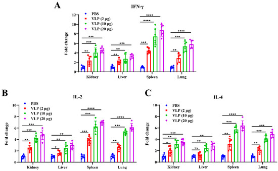 Next, to further characterize the type of Th response induced, qRT-PCR was used to measure the expression levels of key cytokines, including IFN-γ, IL-2, and IL-4, in kidney, liver, spleen, and lung tissues of all immunized mice at 2 weeks post-boost immunization. As shown in Figure 8A, the expression of IFN-γ, a key marker of Th1-type immune response [43], was significantly upregulated in all the tissues of the NDV-S3Q2P-VLP-immunized group compared to the PBS control group. The highest fold change was observed in the spleen, indicating a strong systemic Th1 response. Similarly, IL-2 expression (Figure 8B), another Th1 cytokine [43], was significantly higher in the spleen, lung, and liver of the VLP-immunized mice, compared to controls. In addition, the Th2 cytokine IL-4 [44] was also markedly upregulated in the VLP-immunized mice, particularly in the spleen, lung, and kidney tissues (Figure 8C). Notably, the immune response was dose-dependent: the high-dose vaccine group (20 μg) exhibited significantly higher levels of IFN-γ, IL-2, and IL-4 compared to the low-dose group (2 μg) across all tissues, suggesting a dose-dependent enhancement of both Th1 and Th2 immune responses. These results demonstrate that NDV-S3Q2P-VLP post-boost immunization induces a robust T cell-mediated immunity characterized by both Th1 (IFN-γ, IL-2) and Th2 (IL-4) cytokine production.