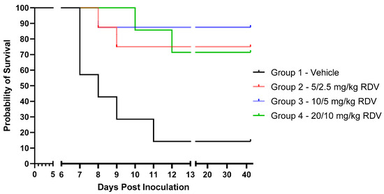 Based on the predefined stepdown procedure, animals in Group 3 (10/5 mg/kg RDV) showed a significantly improved (p = 0.009) survival rate compared to the vehicle-treated control animals in Group 1. While improved survival trends were observed in RDV-treated Groups 4 and 2 compared to vehicle, these differences in survival rates lacked statistical significance based on the stepdown procedure (p = 0.051 and p = 0.032, respectively; Table 3).