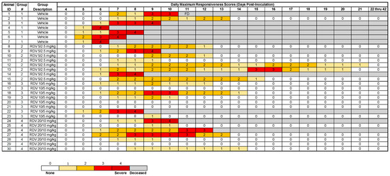 Group 1 (vehicle) animals were first assigned responsiveness scores ≥ 1 on Days 5–7 PI, with seven of seven animals developing signs of illness. Five of seven animals were assigned the maximum responsiveness score of four and were euthanized. One Group 1 animal was found deceased after reaching a maximum score of 3, and one animal survived. For the single surviving Group 1 animal, the maximum responsiveness score was 2; the responsiveness scores for this animal returned to 0 from Day 13 PI through the end of the study.