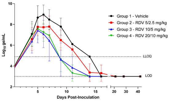 In the vehicle control group, mean viral RNA concentration increased from Day 4 PI (7.08 log10 ge/mL) to Day 5 PI (8.66 log10 ge/mL), reaching a maximum on Day 6 PI (9.01 log10 ge/mL). In samples obtained on Day 5 PI, 1 day after vehicle and RDV treatments were initiated, the mean viral RNA was lower in all RDV-treated groups compared to the vehicle control, although differences were significant only in the 10/5 mg/kg RDV animals (Group 3; p = 0.031). On Day 6 PI, 2 days after initiation of vehicle and RDV treatments, mean viral RNA concentrations were significantly lower in all RDV-treated groups compared to the vehicle control, with mean values ranging from 7.08 log10 ge/mL (Group 3; 10/5 mg/kg RDV) to 9.01 log10 ge/mL (Group 1; vehicle). On Day 7 PI, mean viral RNA concentration was 8.47 log10 ge/mL in the vehicle control, and lower mean values were observed in all RDV-treated groups compared to vehicle, although the difference was significant only for Group 3 (10/5 mg/kg RDV; p = 0.023). Meaningful statistical comparisons after Day 7 PI were precluded by mortality events occurring primarily in the vehicle control group. All viral RNA samples were below the LLOQ after Day 11 PI.