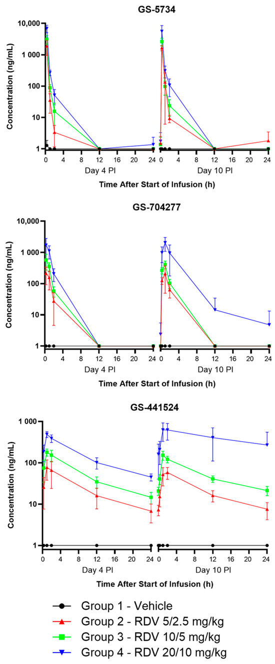 Plasma was analyzed via liquid chromatography coupled with tandem mass spectrometry to determine concentrations of RDV and its two major systemic metabolites, GS-441524 and GS-704277 (Figure 4 and Table 5).