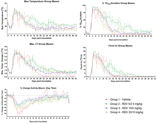 Animals in Group 4 (20/10 mg/kg RDV) showed a pattern of significant temperature elevations and fever events similar to that of the 10/5 mg/kg RDV group, with the exception of the two nonsurviving animals. The onset of significant temperature elevation was between 2.75 and 5.10 days after challenge for all Group 4 animals. Periods of hyperpyrexia were observed in four animals.