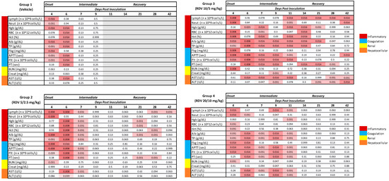 Timing of statistically significant clinicopathologic changes. The p-values shown represent the comparison to baseline within each group. Alb, albumin; Creat, creatinine; Fbg, fibrinogen; Hct, hematocrit; Hgb, hemoglobin; Lymph, lymphocytes; Neut, neutrophils; Plt, platelets; RBC, red blood cells; TP, total protein. White cells denote a lack of significance; pink shading is a heatmap, with deeper pink denoting greater significance. p-values of 0.999 are >0.999.