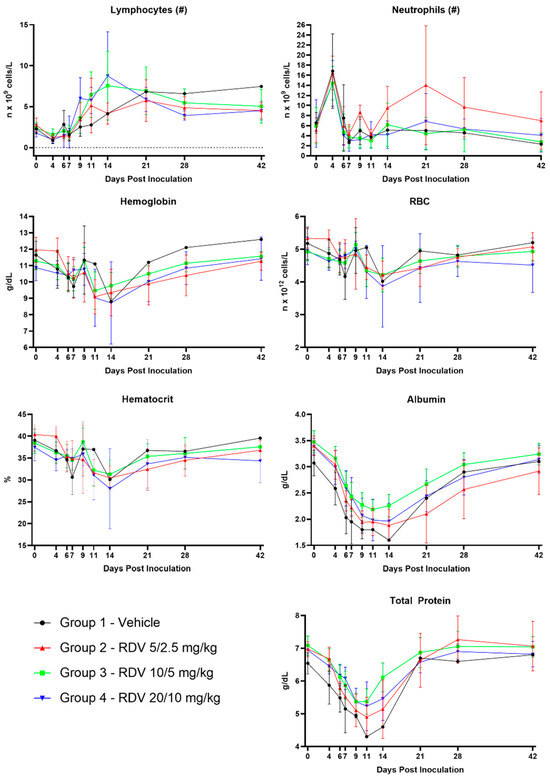 RDV treatment, regardless of dose, often resulted in amelioration of many of the clinical pathology changes. Based on survival and clinical pathology endpoints, Group 3 (10/5 mg/kg RDV) appeared to be the most efficacious treatment regimen. Increases in BUN and creatinine concentrations were mitigated, and evidence of hepatocellular damage and coagulopathy was ameliorated. Lymphocyte counts also recovered more robustly than those noted in Group 1 (vehicle) or Group 2 (5/2.5 mg/kg RDV). Although speculative, this may suggest an earlier improvement in lymphocyte-associated immune function.