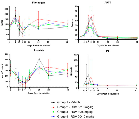 Figure 6 summarizes statistically significant changes in clinical pathological parameters. The key disease signs supported by the clinical pathology parameters include evidence of systemic inflammation, blood loss, changes in coagulation parameters suggestive of disseminated intravascular coagulopathy (DIC), and hepatocellular injury in all groups (Figure 7, Figure 8, Figure 9 and Figure 10). Data supporting alterations in glomerular filtration rates were generally limited to Group 1 (vehicle) and Group 4 (20/10 mg/kg RDV). Incipient EVD is suspected in all groups by Day 4 PI. Group 1 (vehicle) progressed to show evidence of fulminant disease, such as worsening clinicopathological indices and in-life observations of epistaxis, cutaneous hemorrhages, and increased daily maximum responsiveness score. Additionally, microscopic observations of hemorrhage and thrombi in multiple organs suggestive of DIC, hepatocellular necrosis, and renal tubular necrosis were observed in many animals that succumbed to disease.