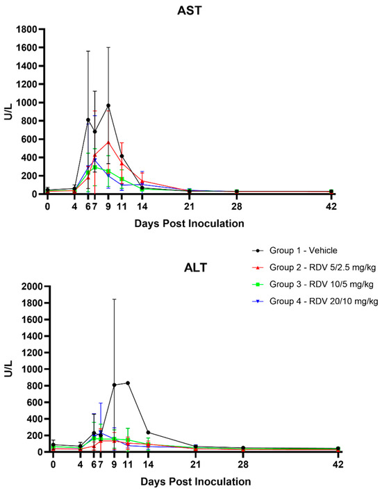 Hepatocellular parameters. Figures show group means by day; vertical bars represent standard deviation. ALT, alanine aminotransferase; AST, aspartate aminotransferase.