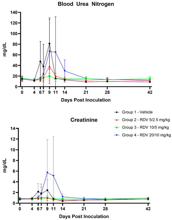 Group 4 treatment (20/10 mg/kg RDV) also resulted in amelioration in a subset of clinical pathological parameters. However, this dosing regimen may have impacted renal function in monkeys. One animal in Group 4 was diagnosed with acute renal failure during RDV treatment, with microscopic correlates of renal tubular necrosis and cellular casts noted. Additionally, a subset of animals in this group had creatinine concentrations that remained elevated longer than those of animals in other groups. Consistent microscopic correlates were not present in these animals, but azotemia had resolved in surviving animals by the end of the study, suggesting a transient impact on renal function.