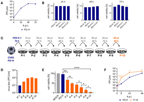 Adaptation of PD-H to MC38 cells. (A) Virus growth kinetics. MC38 cells were infected with PD-H at MOI 0.1. Virus titer was determined by plaque assay 24 h, 48 h, and 72 h p.i. Shown are mean values ± SEM (n = 3). (B) Cell viability of MC38 cells after infection with PD-H. MC38 cells were infected with PD-H at the indicated MOI. Cell viability was measured by XTT assay after 24 h, 48 h, and 72 h. Cell viability was normalized to untreated cells (=100%). Shown are mean values ± SEM (n = 3). (C) Scheme of the serial passaging of PD-H on MC38 cells. For P1, cells were infected with PD-H at MOI 0.1 and incubated for 72 h. For further passaging to P10, the stated amount of a 1:10 dilution was added to fresh MC38 cells and incubated for the indicated time. (D) Development of viral titers during serial passaging of PD-H on MC38 cells. The virus titers were determined by plaque assay on HeLa cells. (E) Changes in the ability of PD-H to lyse MC38 cells during passaging. MC38 cells were infected with PD-H, P-2, P-4, P-5, P-6, P-8, and P-10 at MOI 1. Cell viability was measured by XTT assay 48 h after infection. Shown are mean values ± SEM (n = 3). Significance, * p < 0.05; ** p < 0.01; **** p < 0.0001. (F) Virus growth kinetics. MC38 cells were infected with PD-H and P-10 at MOI 0.1. Virus titer was determined by plaque assay. Shown are mean values ± SEM (n = 3). Significance compared to PD-H, * p < 0.05; **** p < 0.0001.