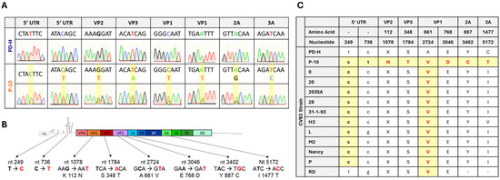 Sequence analysis of P-10 and comparison of P-10 with other CVB3 isolates. (A) Analysis of mutations that occurred in P-10. Shown are eight electropherograms of the sanger sequencing of viral RNA isolated from PD-H and P-10. Nucleotide substitutions are highlighted in yellow boxes. For seven mutations, a double signal in sanger sequencing was detected. (B) Scheme of the genome of PD-H. The location of the mutations, the mutated nucleotides, and the resulting amino acid substitutions detected in P-10 are indicated. (C) Comparison of the nucleotide and amino acid substitutions found in PD-10 with other CVB3 strains. Only a partial cDNA is available for the RD strain; no comparison was carried out for the mutations in 2A and 3A protein.