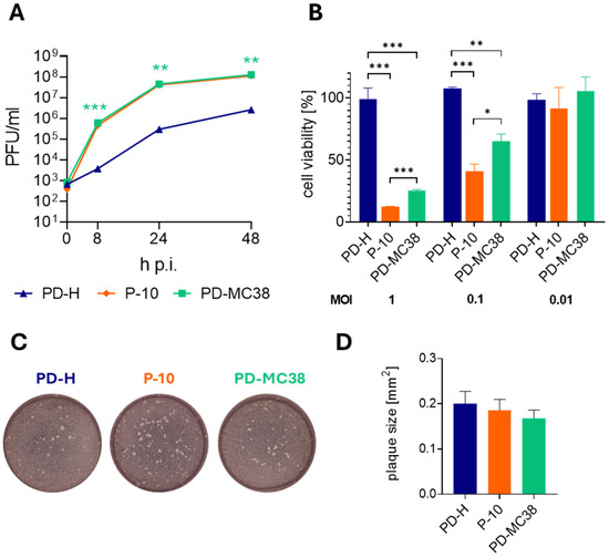 For serial passaging, 1.75 × 105 MC38 cells per well were seeded in 24-well plates. Twenty-four hours later, the cells were infected with PD-H at an MOI of 0.1 for passage 1 (P1) or with 15 µL (P-2), 20 µL (P-7), 25 µL (P-9), or 30 µL (P-3, P-4, P-5, P-6, P-8, P-10) of a 1:10 dilution of virus-containing cell culture supernatant from the previous passage. Before adding the virus solution to the MC38 cells, the volume was adjusted to 100 µL with MC38 cell culture medium. The cells were incubated with the virus solution for 48 h (P-5, P-6, P-8, P-10) or 72 h (P-1, P-2, P-3, P-4, P-7, P-9) until cell lysis was visible. The viruses were isolated by three freeze–thaw cycles, and cell debris was removed by centrifugation. Viruses were stored at −20° until use.