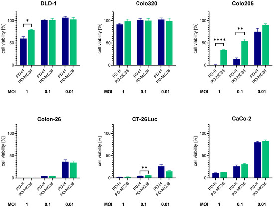 Comparison of oncolytic efficiency of PD-MC38 and PD-H in different colorectal cancer cell lines. The colorectal cancer cell lines DLD-1, Colo320, Colo205, CaCo-2, Colon-26 and CT-26Luc were infected with PD-H and PD-MC38 at the indicated MOI; cell viability was measured 48 h after infection with XTT assay. Shown are mean values ± SEM (n = 3). Significance, * p < 0.05; ** p < 0.01; **** p < 0.0001.