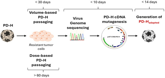 In conclusion, we demonstrate that the adaptation of PD-H to a resistant colorectal tumor cell line can be expedited through the application of a volume-based passaging procedure. By incorporating the acquired mutations into the PD-H founder, a viral clone that fixes the characteristics of the adapted virus can be efficiently and rapidly generated. This method may contribute to enhancing the feasibility of developing PD-H for personalized therapies in patients. Moreover, given its potential applicability to other oncolytic RNA viruses, the utility of this approach could extend well beyond the oncolytic CVB3 PD-H model investigated in this study.
