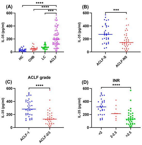 The baseline levels of plasma IL-35 were measured in enrolled participants. The levels of plasma IL-35 were compared in different disease stages (A), clinical outcomes (B), ACLF grades (C), and groups of HBV-ACLF patients divided by INR (<2, 2–2.5, >2.5) (D). *** p < 0.001, **** p < 0.0001. IL-35, interleukin-35; HBV, hepatitis B virus; ACLF, acute-on-chronic liver failure; INR, international normalized ratio.
