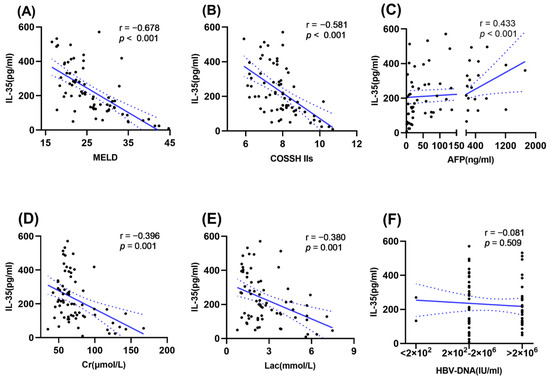 The correlation analysis between plasma IL-35 levels and MELD (A), COSSH IIs (B), AFP (C), Cr (D), lactate (E), and HBV-DNA (F) in HBV-ACLF. IL-35, interleukin-35; HBV, hepatitis B virus; ACLF, acute-on-chronic liver failure; MELD, model for end-stage liver disease; COSSH IIs, Chinese Group on the Study of Severe Hepatitis B ACLF II score; AFP, alpha fetal protein; Cr, creatinine.