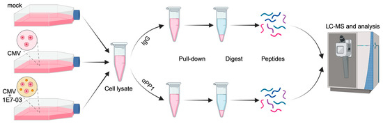 To investigate the PP1 interactome and PP1 regulatory subunits during HCMV infection, we adapted an unbiased approach for profiling PP1 interactors based on label-free quantification [23] (Figure 1). This protocol was first refined using lysates from uninfected HFF cells, and then applied to samples from HCMV-infected HFF cells at selected time points. Analysis was performed at the 4 h and 96 h time points post-infection to capture both immediate early interactions with host mechanism and extensive host cell reprogramming and viral replication dynamics.