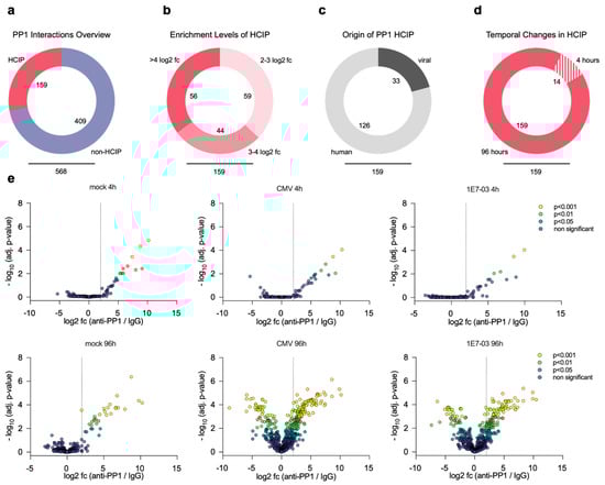 (a) Total number of proteins and HCIP identified by mass spectrometry (b) Proportions of HCIP enrichment levels (c) Abundance proportions of host and viral PP1 HCIP. (d) Temporal distribution of HCIP, showing early (4 h) and late (96 h) interactors. (e) Mock infected HFF or HCMV infected HFF or PP1 inhibitor pretreated HCMV infected HFF were lysed and immunoprecipitated with anti-PP1 versus isotype-control IgG 4 h p.i. or 96 h p.i. and analyzed by MS. The x-axis plots the log2 fold change in anti-PP1 to IgG control. The y-axis shows the −log10 of the adjusted p-values. Proteins with a ratio > 2 and an adjusted p-value < 0.05 are considered PP1 interactors.