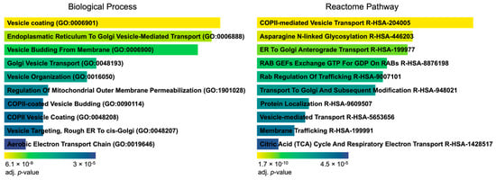 Pathway enrichment analysis of human PP1 HCIP revealed significant alterations in intracellular protein trafficking processes following HCMV infection. These enrichments of PP1 HCIP were particularly evident in processes such as vesicle coating, targeting, and budding (Figure 4). Most notably, pathways mediating transport between the rough endoplasmic reticulum and the cis-Golgi apparatus were prominently affected.