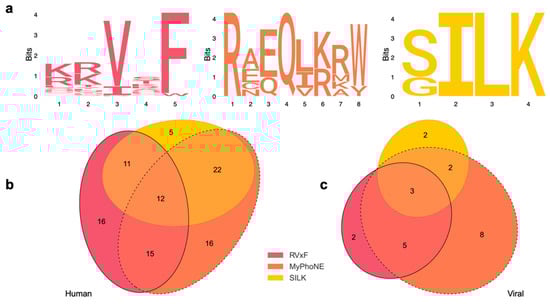 (a) Sequence logos of PP1-docking motifs. The logos visualize amino acid conservation among the HCIP across three primary docking motifs of PP1. The x-axis denotes residue positions, while the y-axis, in bits, reflects the conservation level. Larger letters indicate higher frequency amino acids, emphasizing conserved regions within the motifs. (b,c) Venn diagrams representing the overlap among human and viral PP1 HCIP that possess the three respective PP1-docking motifs: RVxF, MyPhoNE, and SILK.