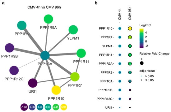Of the 159 PP1 HCIP, 11 were previously described as PP1 regulatory subunits (PP1Rs), each bearing a PPP1R designation according to the HUGO Gene Nomenclature Committee database. In the HCMV group, all detected PP1Rs exhibited significant temporal differences in the PP1 interactions between the early (4 h) and late (96 h) stages of infection (Figure 6a,b). Protein interaction network mapping revealed dynamic changes in these interactions (Figure 6a). Specifically, the interaction with PPP1R10 (PNUTS) was found to be most enriched over the course of the infection, whereas the interaction with URI1 (PPP1R19) showed the most pronounced decrease.