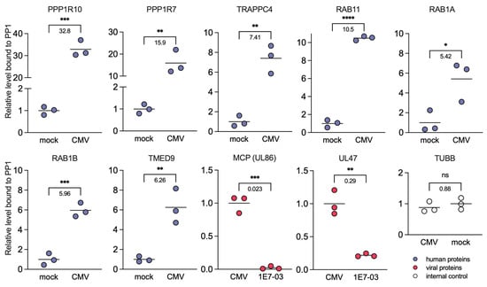 Comparison of binding between PP1 and HCIP during HCMV infection. Alterations in the binding of PP1 interactors 96 h post HCMV infection (n = 3). Quantification was derived from LFQ signals, with TUBB serving as an internal control. ns = not significant, * p < 0.05, ** p < 0.001, *** p < 0.0001, **** p < 0.00001. Fold change numbers are displayed below the brackets. Comparisons as described on x-axis (CMV vs. mock or CMV + 1E7-03 vs. CMV).