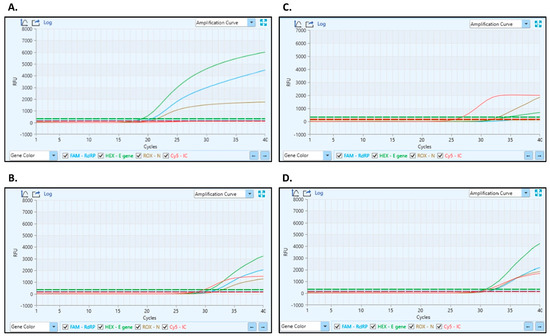 SARS-CoV-2 RNA detection via RT-PCR was performed with the LiliF™ SARS-CoV-2 Kit (iNtRON Biotechnology, Republic of Korea), which targets the E gene (HEX), N gene (ROX), and RdRp gene (FAM). RNase P (Cy5) was used as an internal control to verify RNA extraction from human-derived samples. A negative RNase P result, with positive findings for other targets, does not affect result interpretation.