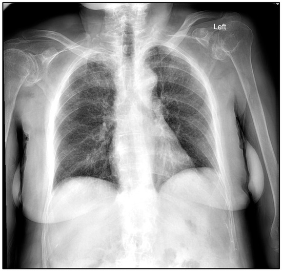 Nasopharyngeal (NP) antigen testing and quantitative reverse transcription polymerase chain reaction (RT-PCR) confirmed the diagnosis of SARS-CoV-2 infection (Figure 1A and Table 1). Additionally, a nasopharyngeal swab identified a high bacterial load of penicillin- and ampicillin-resistant Staphylococcus aureus (105 CFU/mL), necessitating careful consideration of antibiotic therapy. Chest X-ray failed to demonstrate any pathological changes (Figure 2). The patient was admitted for comprehensive management, with an initial treatment regimen comprising conservative measures, including 5 L per minute of oxygen supplementation, intravenous crystalloids for hydration, and subcutaneous fondaparinux for thromboembolic prophylaxis.