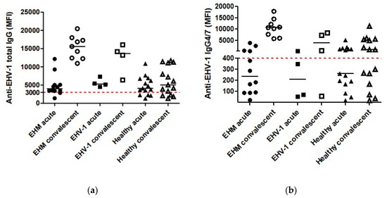 (a) Anti-EHV-1 total IgG in acute and convalescent serum samples collected from horses with EHM, EHV-1 infection and healthy horses involved in an outbreak. The median is represented by horizontal bars at each time point. The red dotted line at 3000 MFI represents the protective cut-off for the EHV-1 risk evaluation assay. Antibody levels are expressed as median fluorescence intensity (MFI). (b) Anti-EHV-1 IgG 4/7 in acute and convalescent serum samples collected from horses with EHM, EHV-1 infection and healthy horses involved in an outbreak. The median is represented by horizontal bars at each time point. The red dotted line at 400 MFI represents the protective cut-off for the EHV-1 risk evaluation assay. Antibody levels are expressed as median fluorescence intensity (MFI).
