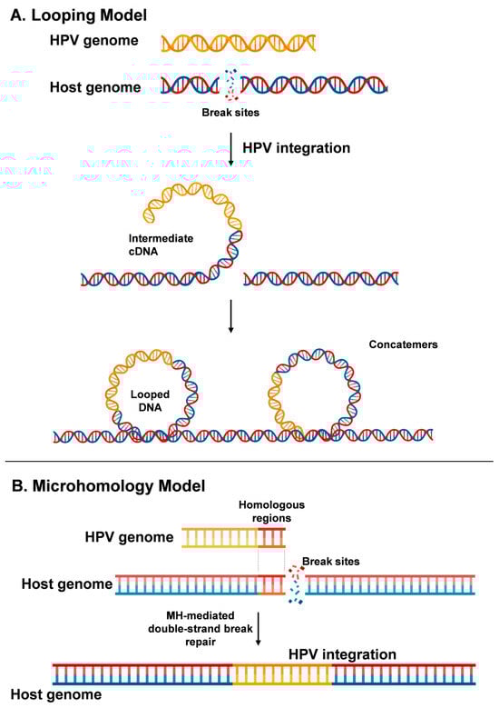 Two models have been proposed to describe the integration process: (1) the Looping Model, which suggests that HPV integrates by forming a non-contiguous bridge between human DNA at the two double-stranded break sites [65] (Figure 1A), and (2) the Microhomology Model, which proposes interactions between homologous regions of HPV and human DNA break sites (Figure 1B).