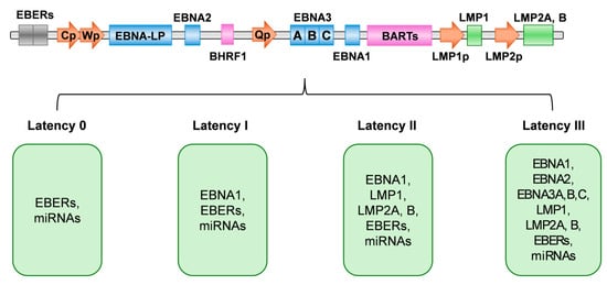 In latent infection, a restricted set of genes different from those expressed during the lytic cycle is transcribed. In relation to latency genes, the EBV genome encodes for nine proteins (Epstein–Barr Nuclear Antigens, EBNAs, and Latency Membrane Proteins, LMPs), two Epstein–Barr virus (EBV)-encoded small RNAs (EBERs), and 44 miRNAs generated from the BamHI-A Rightwards Transcripts (BARTs). The genes of the six EBNAs (EBNA-LP, EBNA1, EBNA2, EBNA3A, EBNA3B, and EBNA3C) and the three LMPs (LMP1, LMP2A, and LMP2B) are transcribed from five different promoters (Cp, Wp, Qp, LMP1p, and LMP2p) [126] (Figure 2).