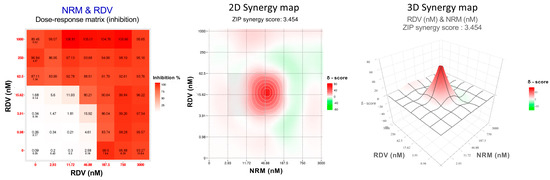 Dose–response matrix, two-dimensional (2D) and three-dimensional (3D) synergy maps generated using SynergyFinder 3.0 by applying the ZIP model on the Nirmatrelvir (NRM)/Remdesivir (RDV) combination tested against the ancestral B.1 SARS-CoV-2 strain.