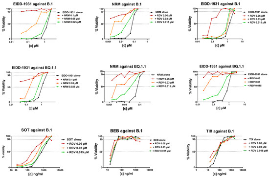IC50 synergistic potency shift experiments in B.1 or BQ.1.1 virus infected VERO E6 cells treated with three fixed drug concentrations of Compound 1 (as indicated in the graph title) plus scalar concentrations of Compound 2 (as indicated in the legend). The three concentrations of Compound 1 were chosen as the IC50 of Compound 1 alone, plus two 2-fold dilutions. The scalar concentration of Compound 2 is the same as that used in the SynergyFinder 3.0 matrix. The concentration of Compound 2 on the x-axis is expressed as micromolar for DAA and as ng/mL for mAb, while the y-axis shows the percentage of cell viability. DAA/DAA combinations were tested against the ancestral B.1 SARS-CoV-2 strain and the BQ.1.1 Omicron variant, while RDV/mAb combinations were tested only against the ancestral B.1 SARS-CoV-2 strain. Graphs were generated using GraphPad PRISM software version 9 (La Jolla, CA, USA).