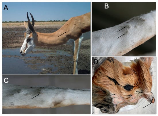 Clinical signs of LSD on various springbok animals. (A) Picture of a springbok with LSD-like nodules (example of a nodule indicated with an arrow) from a camera-trap submitted by P. Christe. (B,C) Skin nodules (arrows) on the legs of springbok sample SB2366-FS_RSA_2011. (D) Skin lesion (arrow) of sample SB11-FS_RSA_2011 used during the extraction of vDNA for NGS.